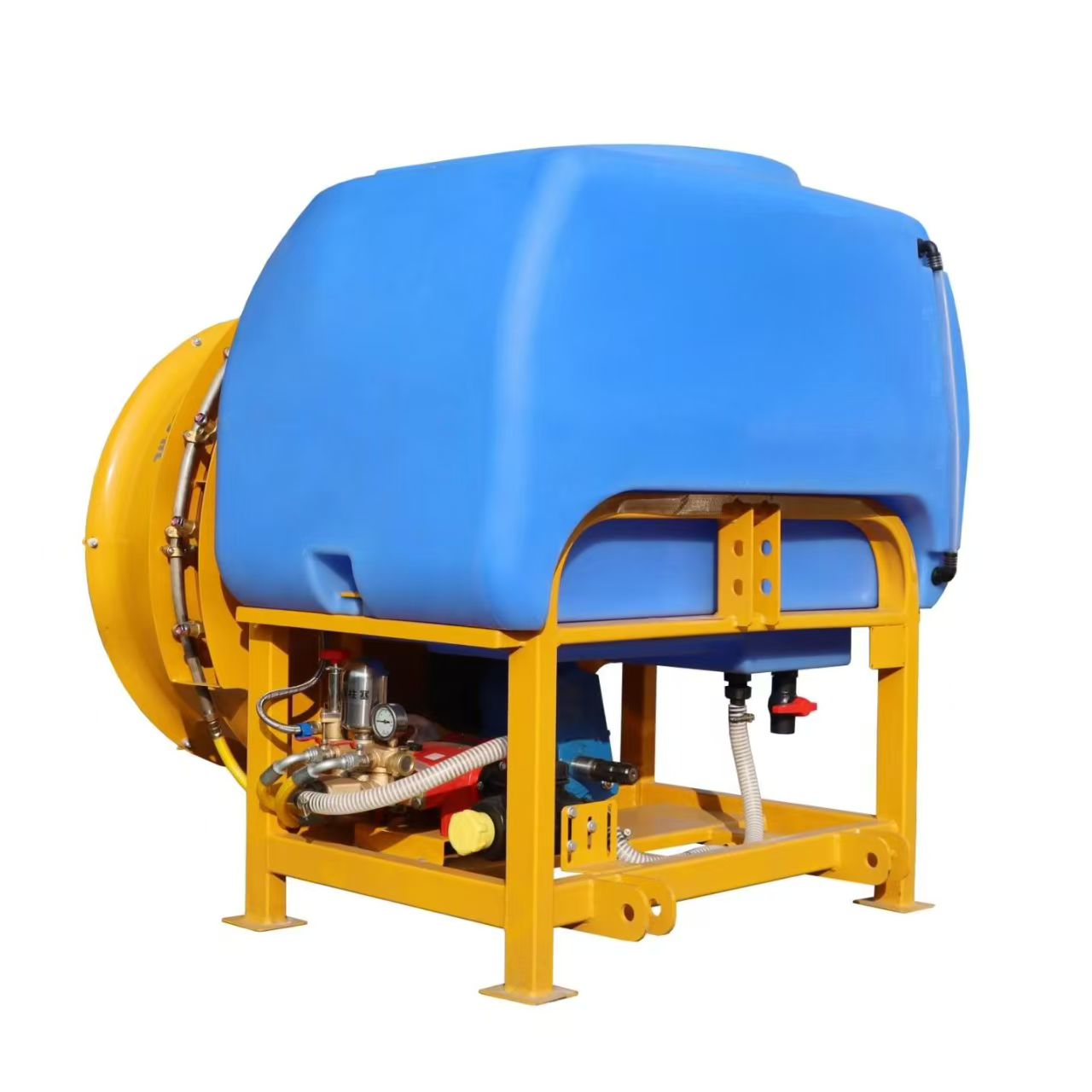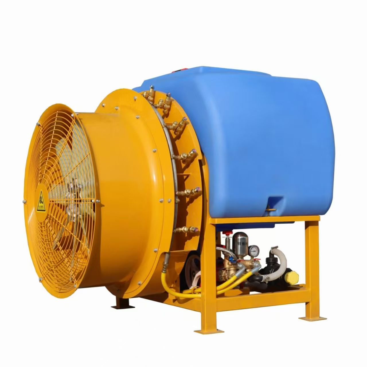 - Компоненты распылительного блока: оборудованы центробежными вентиляторами высокого давления (поток воздуха до 8000-12000 м³/ч), баками из устойчивого к коррозии полиэтилена (емкостью 500-1000 л) и регулируемыми латунными форсунками. Вентилятор генерирует сильные потоки воздуха, переносящие капли, обеспечивая равномерное покрытие с обеих сторон листьев.