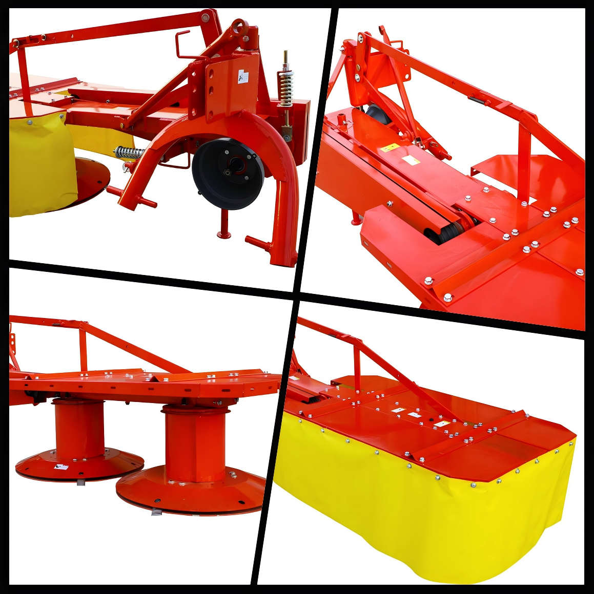 Навесная газонокосилка состоит из четырех основных частей: монтажного кронштейна трактора, высокопрочных режущих лезвий, системы трансмиссии с зубчатым приводом и перегородки для блокировки мусора. Монтажный кронштейн навесной газонокосилки регулируется и подходит для большинства моделей тракторов (50–120 л.с.), представленных на рынке. Режущие лезвия навесной газонокосилки изготовлены из хромомарганцевой стали, устойчивой к износу и деформации при высокоскоростном вращении. Система с зубчатым приводом навесной газонокосилки обеспечивает стабильную передачу усилия, предотвращая проскальзывание во время работы.