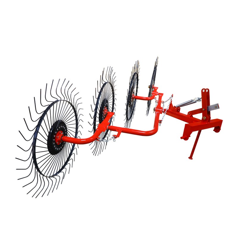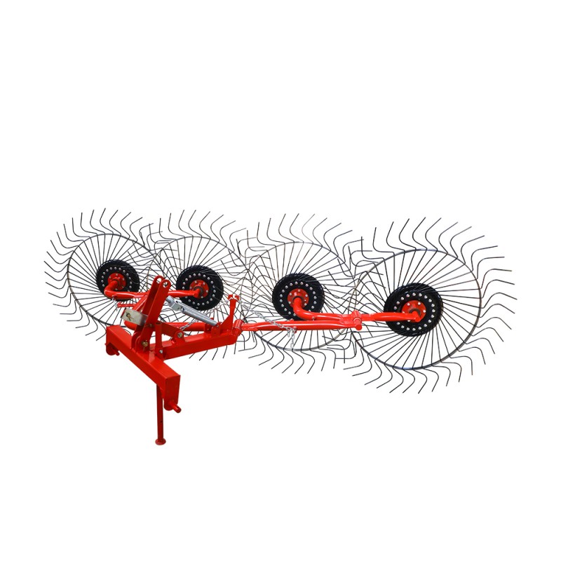 Эти колесные грабли для сена имеют высокопрочную стальную раму, зубья граблей из марганцовистой стали толщиной 12 мм и герметичные коррозионно-стойкие подшипники. Эти компоненты работают вместе. Обеспечьте их долговечность даже в суровых сельскохозяйственных условиях. Прецизионная система привода отбора мощности (ВОМ) соединяет колесные грабли с трактором. Регулируемая без инструментов ручка регулирует ширину и угол наклона колесных граблей. Усиленные ступицы колес повышают устойчивость при работе на высокой скорости.